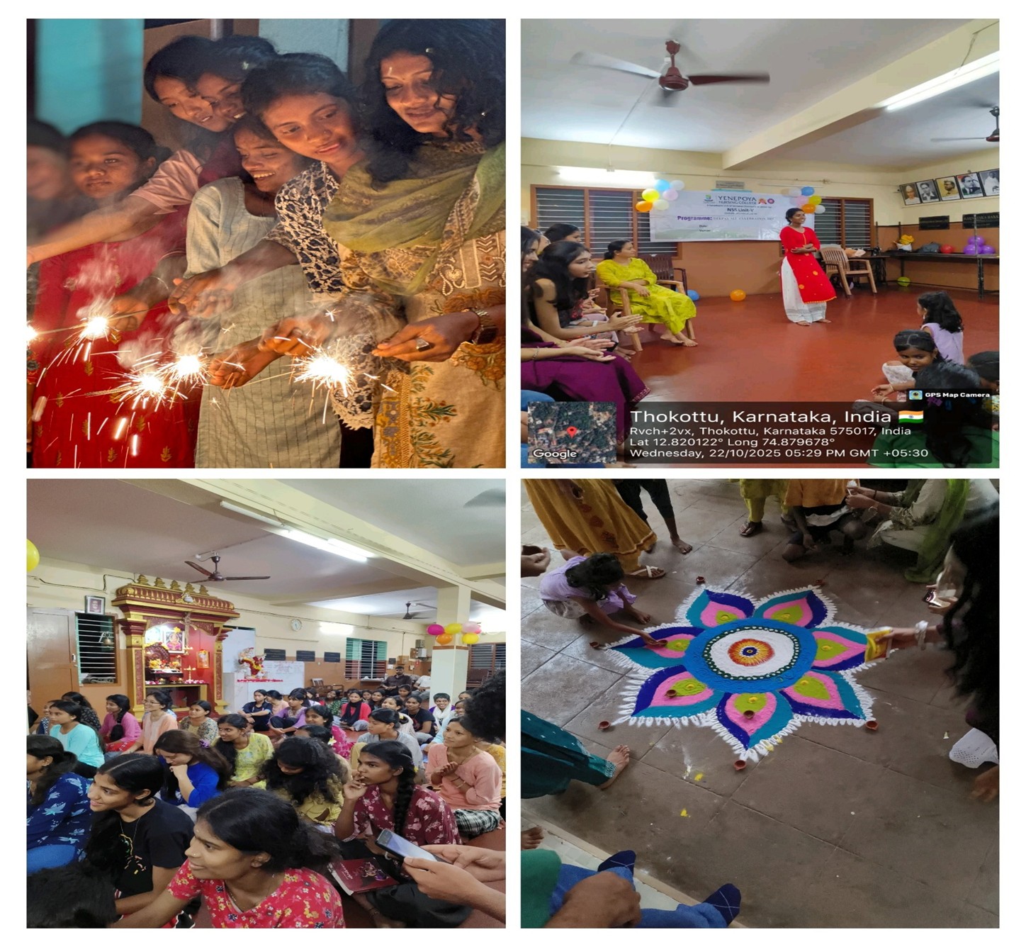 The NSS Unit V of the Nursing College organized a Dipavali celebration at Balasambrakshana Kendra, Kuthar, on 22nd October 2025 from 3:00 PM to 7:30 PM. NSS volunteers and Mrs. Navya actively participated and performed dance programs that entertained the children.