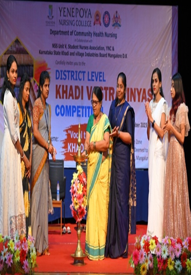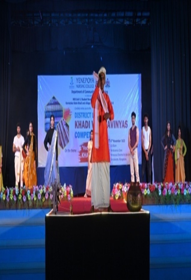 Department of Community Health Nursing Yenepoya Nursing College in collaboration with NSS Unit–V, Student Nurse Association, YNC and Karnataka State Khadi & Village Industries Board, Mangalore D.K organized Khadi Vastravinyas competition on 06/11/2023 at Yendurance Zone, Yenepoya (Deemed to be University), Deralakatte. Mrs. Nagajyothi V. Naik, District Khadi Officer D.K inaugurated the program and highlighted the importance of Khadi and motivated the staff and students to use Khadi clothes. Dr. Leena K.C, Dean, YNC was the presiding officer. Mrs. Nithyashree B.V, Assistant Professor, Department of Community Health Nursing welcomed the gathering. Mrs. Navya, NSS Programme Officer proposed the vote of thanks. Mrs. Vineesha, SNA Advisor compered the program. Inauguration was followed by Khadi Vastravinyas competition on the theme “Vocal to Local”. Seven teams from various colleges took part in the competition. Students of A.J Dental College were declared as winners and students of Yenepoya Physiotherapy College were the runners.