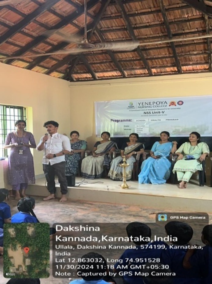The Department of Community Health Nursing in collaboration with NSS Unit V organized a school health program at Government Primary School, Bagambila, Deralakatte, Mangaluru on 02/04/2024. Students performed healthy school environment assessment, health assessment of school children and teachers, and provided education on personal hygiene & good habits. Students performed role play on substance abuse in adolescents and conducted in-service education on learning disabilities for teachers. The headmistress emphasized the nurse’s responsibility in various fields, and Ms. Madhusha compered the program. A total of 45 school children benefited from the program. School teachers and students gave positive feedback and appreciated the efforts of Yenepoya Nursing College students and faculty. Mrs. Navya, Assistant Professor, Department of Community Health Nursing, was the program in-charge.