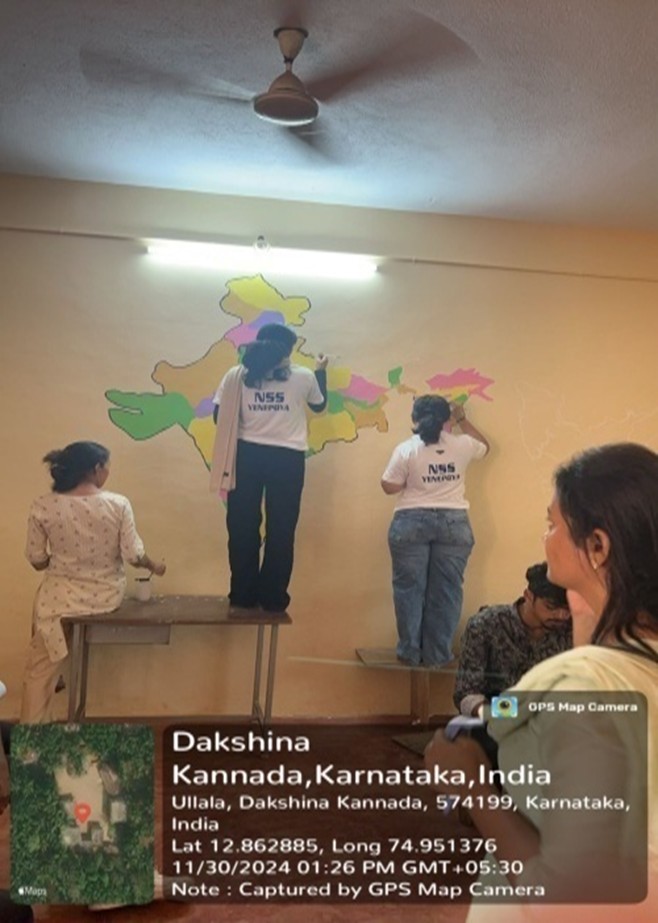 The NSS Unit V in collaboration with Community Health Nursing organized School Health Program on 30.11.2024 at DKZPHP School, Inoli, Mangaluru. NSS volunteers transformed the walls with murals such as Indian map, Karnataka State map, District map, and body parts including heart and digestive system.