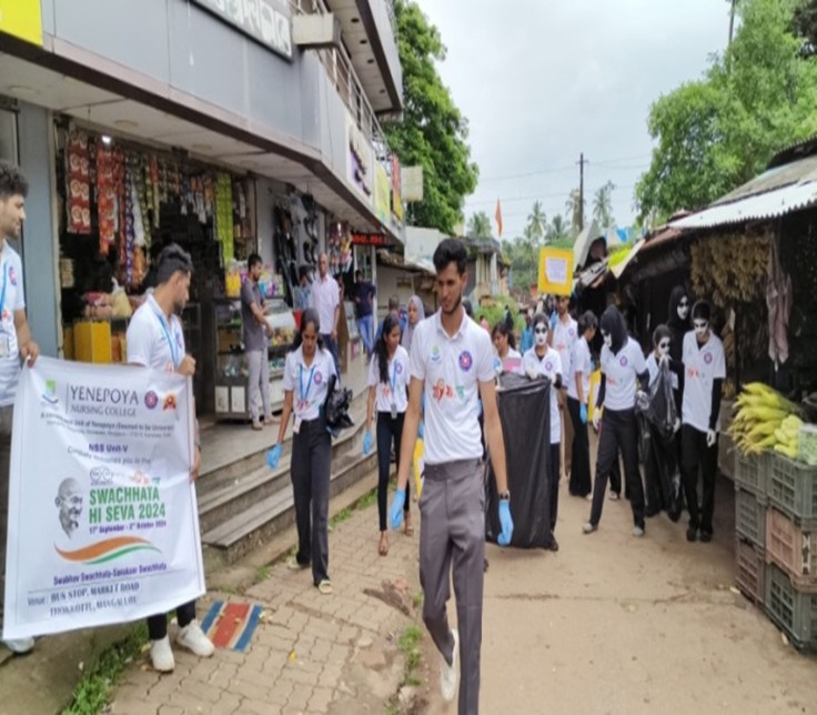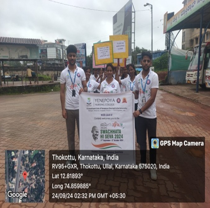Volunteers of NSS Unit V (Yenepoya Nursing College) organized a successful cleaning campaign at Mangalore Central Railway Station in alignment with the "Swachhata Hi Seva" initiative, promoting cleanliness and public hygiene. The campaign took place on 24th & 27th September 2024, starting with a pledge-taking ceremony on cleanliness, followed by a flash mob, mime, and rally emphasizing the importance of maintaining clean surroundings. NSS volunteers then actively participated in cleaning the railway and bus stand premises. The event was conducted in collaboration with railway officials and the Thokkottu Panchayath, and received appreciation for the volunteers' dedication.