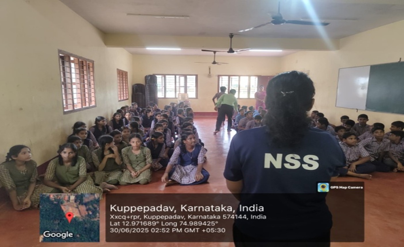 The NSS Unit V organized a Monsoon Awareness Program on 30th June 2025 at Higher Primary School, Yadapadav, from 10:00 AM to 1:00 PM. The program aimed to educate students on common monsoon-related illnesses and their prevention. Mrs. Navya, Assistant Professor, Yenepoya Nursing College, delivered a session covering diseases such as dengue, malaria, typhoid, cholera, and viral fever, explaining their transmission through contaminated water, food, and mosquito bites. Emphasis was placed on personal hygiene, safe drinking water, and use of mosquito repellents. A live handwashing demonstration and distribution of informative leaflets reinforced the message.