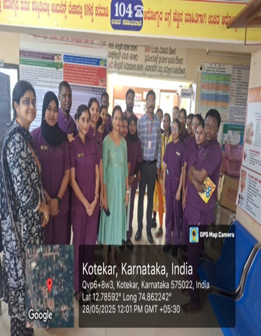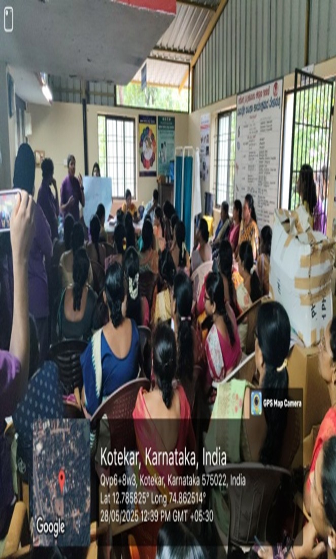 The NSS Unit V organized an extension activity on 28th May 2025 at the Primary Health Centre, Kotekar, from 10:00 AM to 1:00 PM to commemorate Menstrual Hygiene Day. I Year M.Sc. Nursing students actively participated under the guidance of Mrs. Navya (NSS Programme Officer) and Mrs. Amitha (Assistant Professor, Community Health Nursing). The session included an informative health talk on menstrual hygiene, demonstrations of sanitary pads and menstrual cups, and the use of audio-visual aids to enhance understanding.