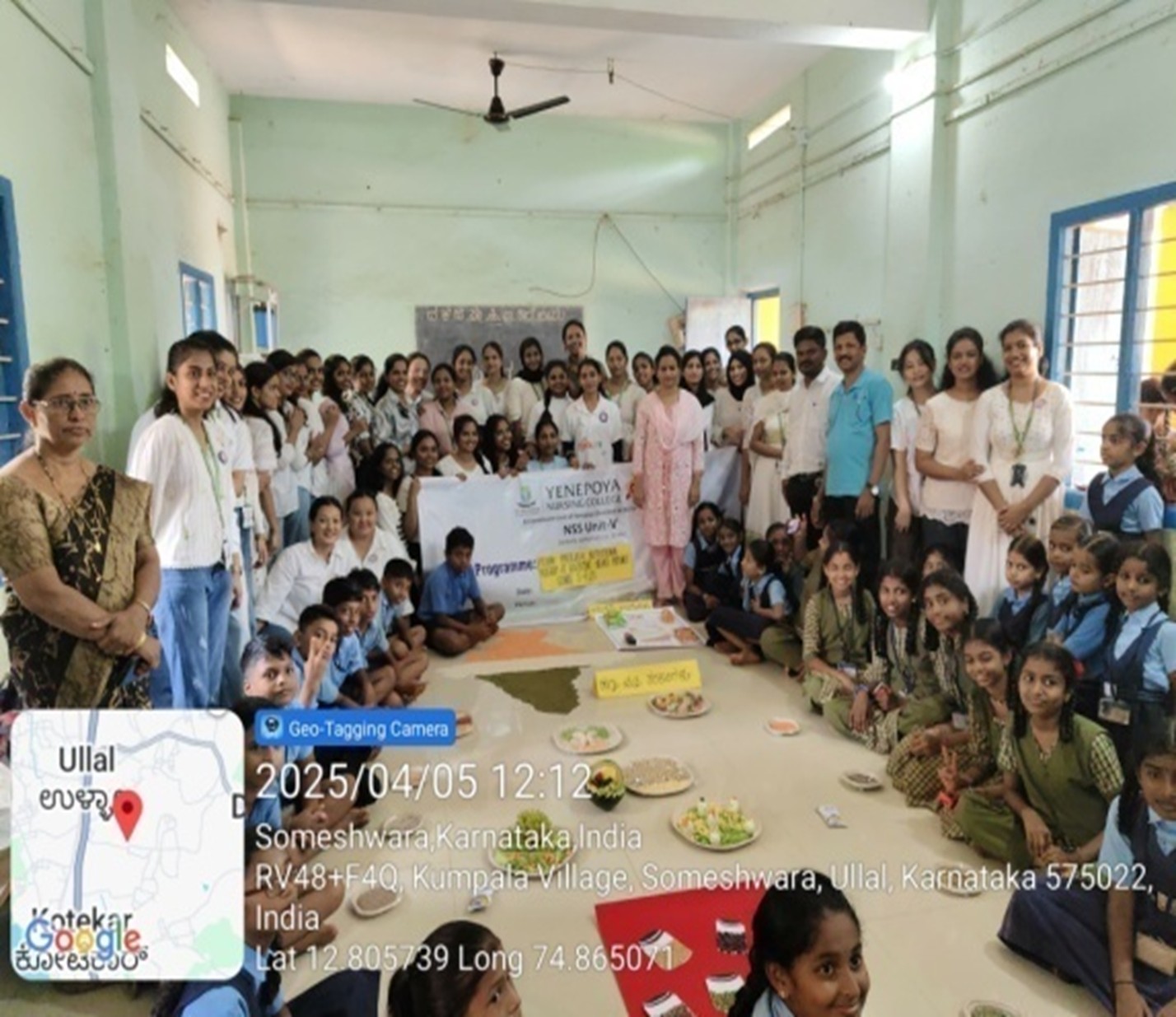 The NSS Unit V, in collaboration with the Department of Community Health Nursing, organized a school health program and Poshan Pakhwada Abhiyan at Higher Primary School, Chethan Nagara, Someshwara on 5th April 2025 from 10:00 AM to 1:30 PM. II BSc Nursing students, along with faculty Mrs. Navya (NSS Programme Officer) and Mr. Anand (Assistant Professor), performed school environment and health assessments, educated students on personal hygiene, and conducted role plays on malnutrition and obesity using audio-visual aids. The program concluded with distribution of refreshments and a feedback and Q&A session.
