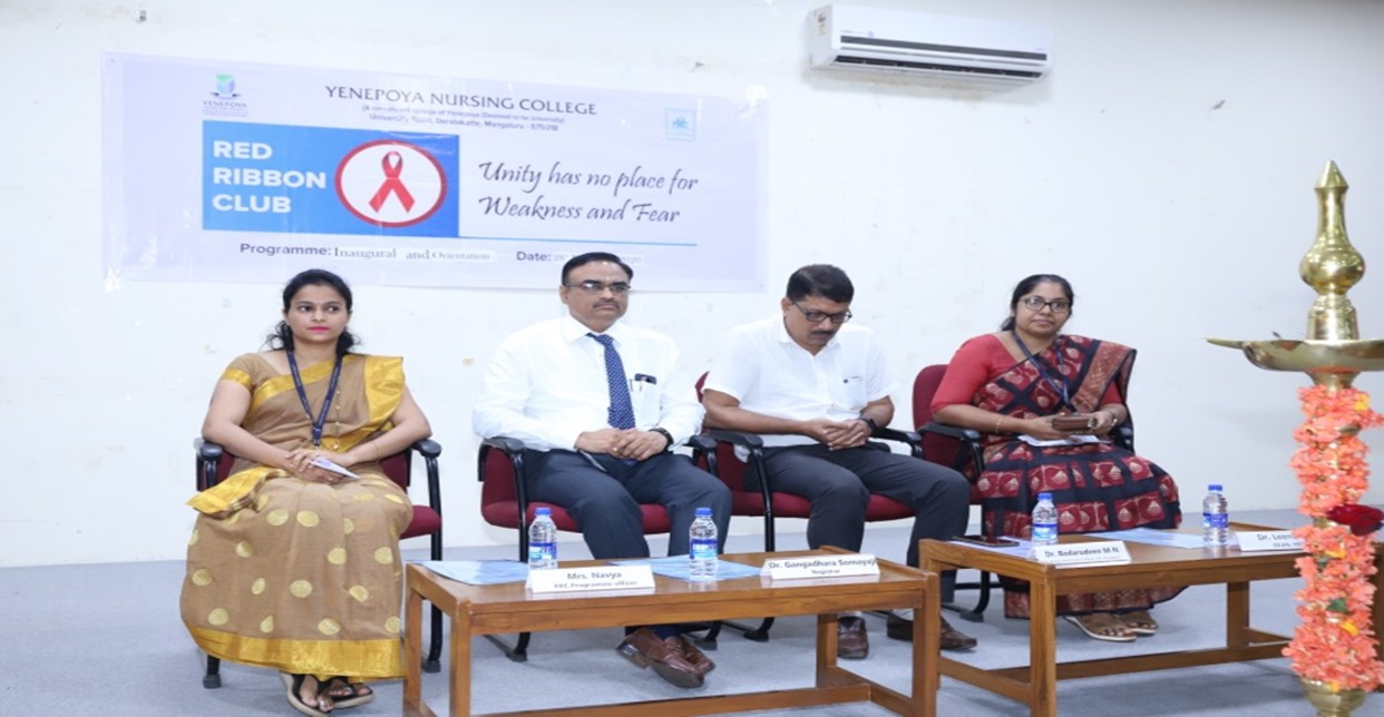 Organized an inaugural and orientation program for the Red Ribbon Club on 28th February 2020 at the Indoor Auditorium, Yenepoya Nursing College. Dr. Badruddin, District AIDS Control Officer, D.K, Mangaluru, was the chief guest. Dr. Gangadhara Somayaji K.S, Registrar, Yenepoya (Deemed to be University) presided over the function. Other dignitaries included Dr. Leena K.C, Dean, YNC & Chairperson, Red Ribbon Club, and Mrs. Navya, Lecturer & Programme Officer, Red Ribbon Club, YNC.