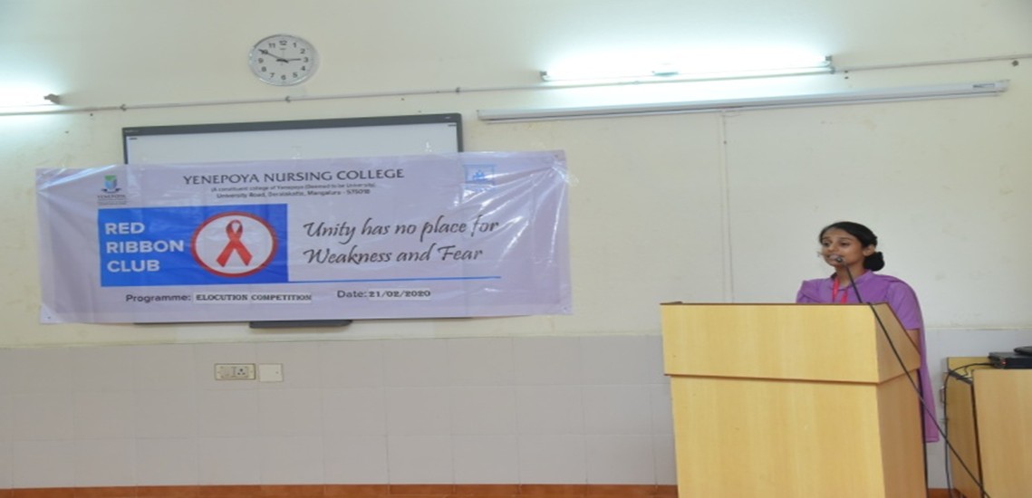 An elocution competition for Red Ribbon Club volunteers on the topic “Importance of Blood Donation” was organized on 21st February 2020 at Yenepoya Nursing College, Board Room, from 10:00 AM to 11:00 AM. Dr. Indian, Deputy Director, Central Laboratory, and Dr. Leena K.C, Principal, judged the program.