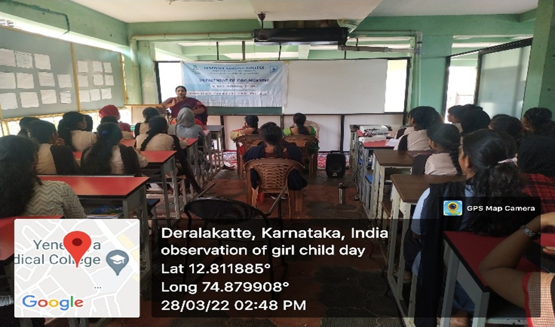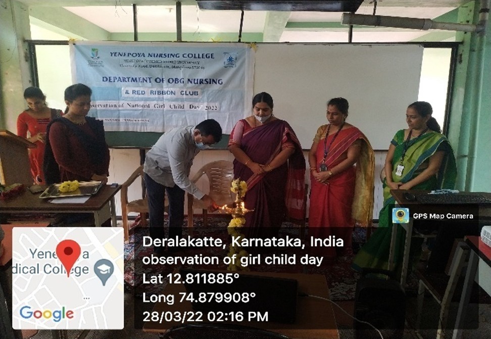 Red Ribbon Club in collaboration with Department of OBG Nursing, Yenepoya Nursing College and Kalpa Trust, Mangaluru observed National girl child day as a part of Azadi Ka Amrit Mahotsav on 28 th March 2022 by organizing an extension activity on “Menstrual Hygiene awareness series withdistribution of Eco-friendly Napkins” at Government Minorities Morarji Desai Girls, PUResidential College, Deralakatte, Mangaluru.