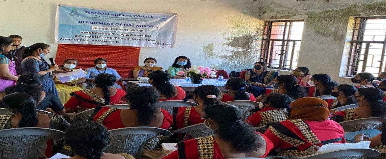 RedRibbonClub incollaborationwith DepartmentofOBGNursing, YenepoyaNursing conductedextensionactivityfor Anganwadiworkerson thetopic“PreventionandManagementof Reproductive tract infection” on 13thJanuary 2022 from 10:00am-1.00pm at CDPO office, SweekaraKendra,Vamanjoor, Mangaluru.